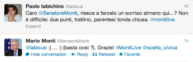 Twitter e la politica, la strana coppia. Per molti inutile (in 140 battute non si spiegano programmi), per altri utile (si entra comunque in contatto con i cittadini). Come la pensiate, oggi - per la prima volta nella politica italiana - un esponente delle istituzioni, Mario Monti, ha risposto ai cittadini attraverso il notissimo sito di microblogging. Seguendo illustri precedenti (Obama on Twitter: GUARDA il VIDEO).